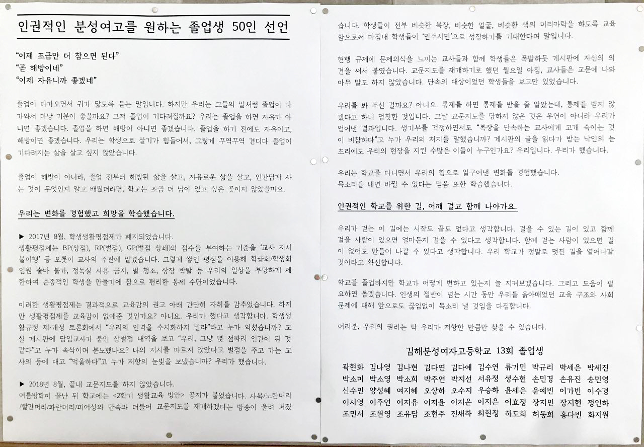 인권적인 분성여고를 원하는 졸업생 50인 선언